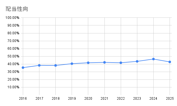 EPSは安定して伸び続けています。配当性向は40%前後で推移しており、無理のない範囲で増配を続けていることがわかります。
