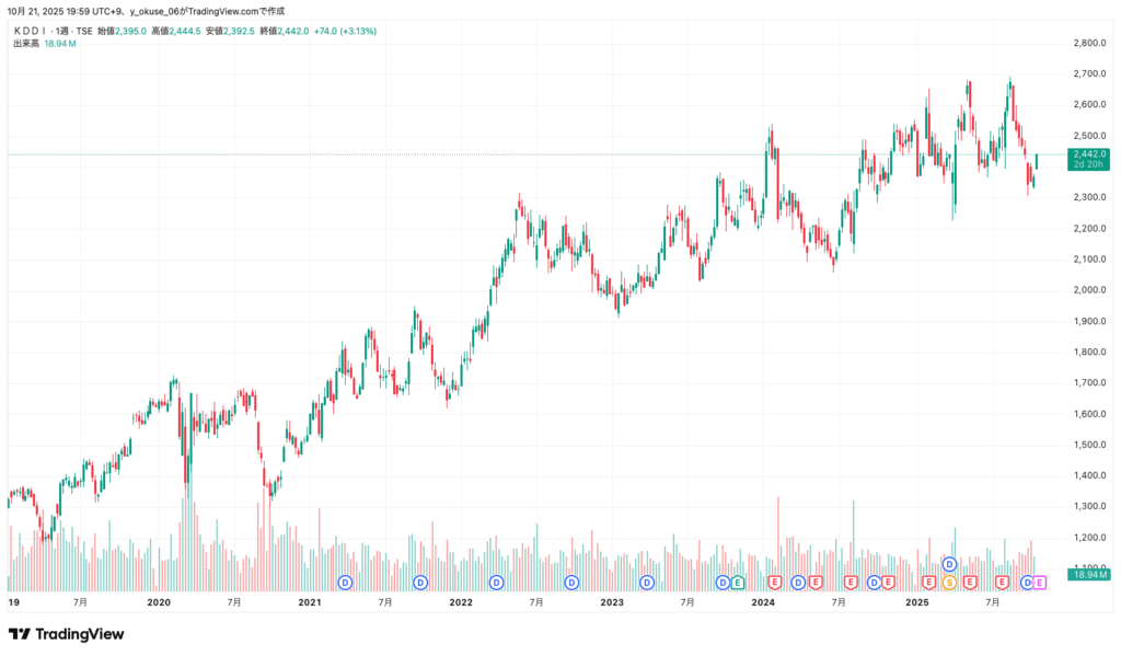 現在の株価はおよそ2,400円ほど。2020年の菅政権誕生時には「携帯料金値下げ圧力」により大きく下落しましたが、その後は堅調に回復し、株価は長期的に右肩上がりで推移してきました。2025年には株式分割も実施され、個人投資家にも購入しやすい水準となっています。